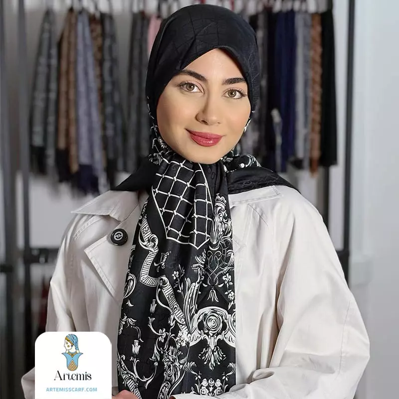 یکی از جذابترین بخشهای این روسری، طراحی خاص و چشمگیر آن است. زمینهی مشکی با نقشهای سفید کلاسیک، جلوهای سلطنتی، اصیل و بسیار شیک ایجاد کرده است. این ترکیب رنگی از آن دسته رنگهایی است که همیشه پرفروش و محبوب باقی میماند، چون با هر سبک مانتو و هر رنگ پوستی بهراحتی ست میشود.